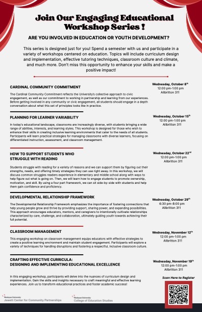“The workshop series was designed to provide additional support to students engaging in education and youth development work. Many of our students in tutoring capacities take advantage of these workshop opportunities as well as office hours to discuss further pathways of connecting to k-12 learners.”